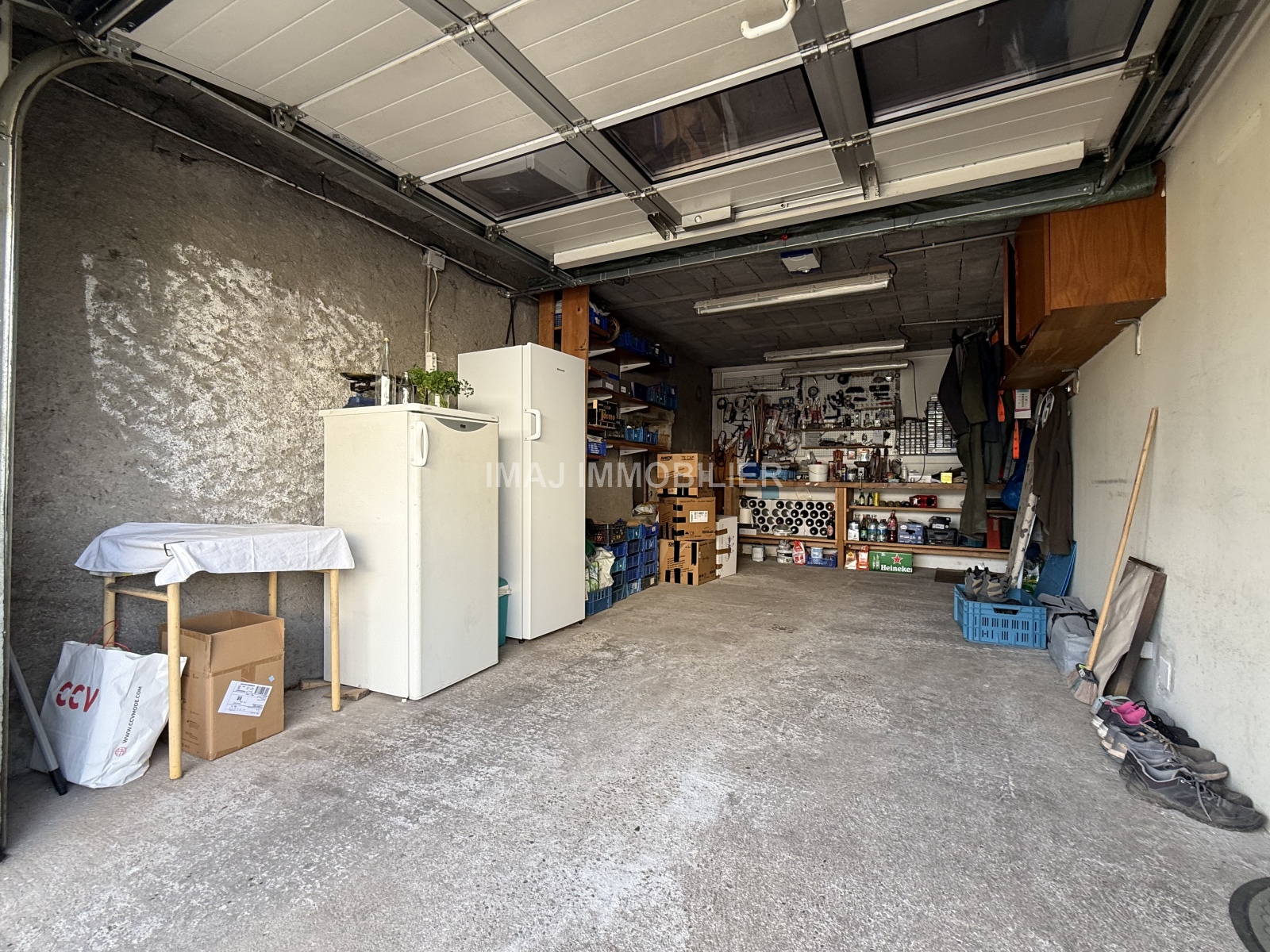 Au rez-de-chaussée : Une entrée, une cuisine équipée séparée, une salle à manger (22,68 m²) ouverte sur le salon (24,79 m²) avec cheminée offrant un accès direct sur la terrasse, une chambre, une salle de bains, un WC séparé, chaufferie et un garage avec porte motorisée (21,61 m²).